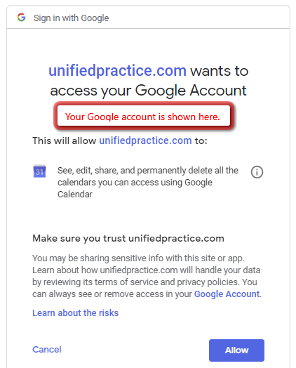 Once your Unified Practice Calendar is synced with your Google Calendar, all appointments made in UP going forward will appear on your Google Calendar in a HIPAA compliant way (no patient identifying information will be pulled into Google). This is also a one-way street, meaning that events you enter on your Google Calendar will not be pulled into Unified Practice.