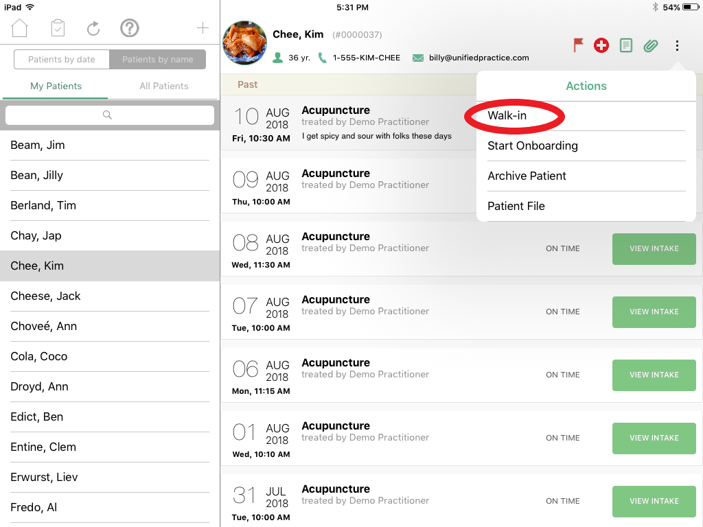 Within the iPad EHR for TCM app, you can start a walk-in appointment if one was not previously scheduled.