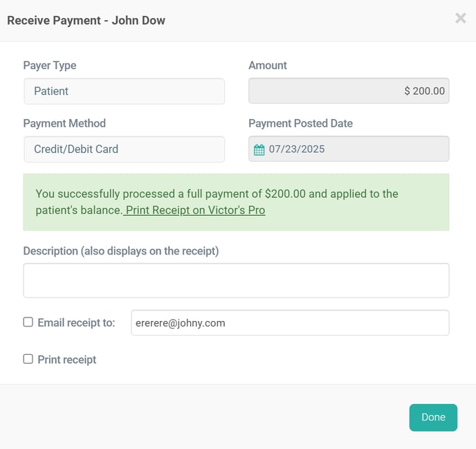 “You successfully processed a full payment of $200.00 and applied to the patient’s balance. Print Receipt on Victor’s Pro”