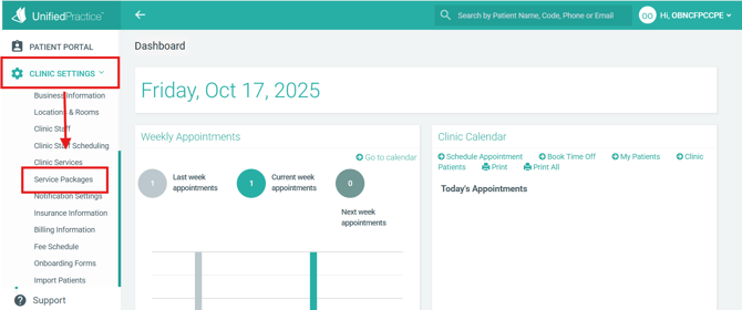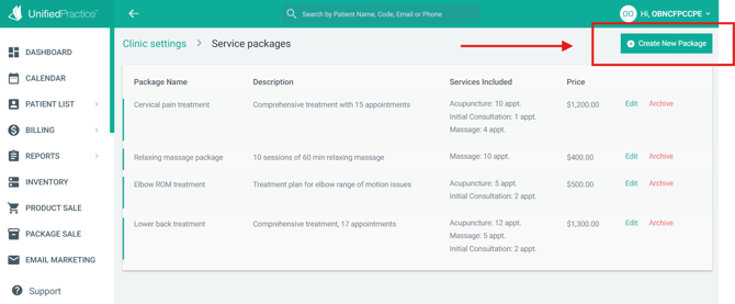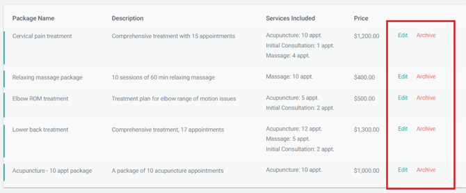 From the Clinic Settings > Service Packages page, you can view all of the packages that were created; as well as Edit or Archive them as needed.