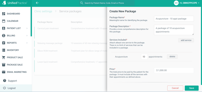 A service package is a pre-paid bundle of multiple treatment sessions offered at a discounted rate compared to paying for each session individually. Our Package Sale feature makes it easy for clinics to create, sell, and manage packages!