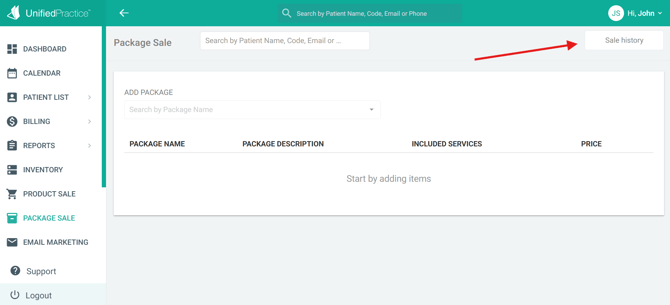 Packages that were already sold can be distributed to services as needed. When entering the "Service Packages" widget, you will only be able to view the Sale History instead of being able to sell a new package