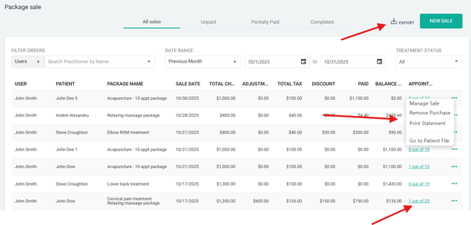 Within the Sale History page, you can filter and sort through your package sales. You can also find important functions such as Export, Remove Purchase, Print Statement, Package Status, etc: