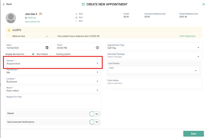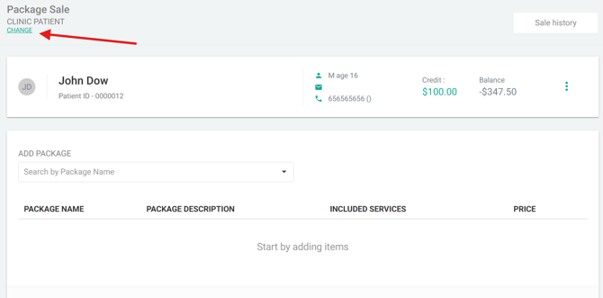 From here, you will be able to get a quick overview of the patient's information, as well as their current balance. You may also change the patient by clicking the "CHANGE" button:
