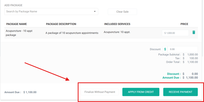 -Manage Sale: Receive Payment or Apply Credit to a package purchase with an outstanding balance. You can also add a discount, or an adjustment to the package sale
