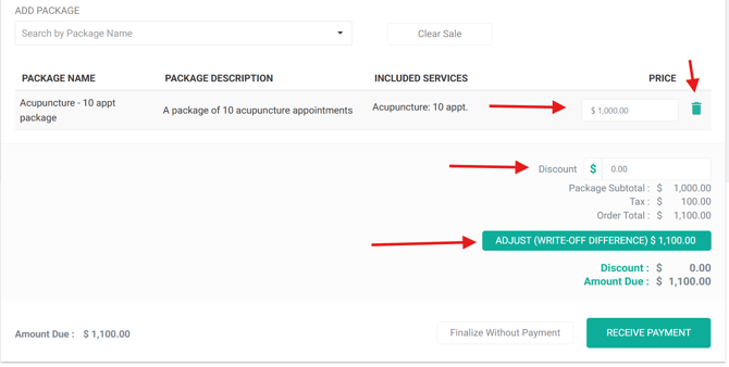 Now, you may review the package(s) that you have added. From here, you may adjust the price, add a discount, write off the difference, or remove the package from the sale:
