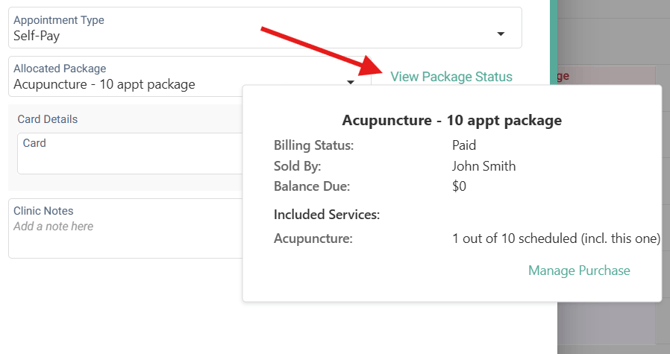 Once the package has been selected, you can also view the Package Status. This will display valuable information, such as the billing status, balance due from the patient, and how many services the patient has left for the package: