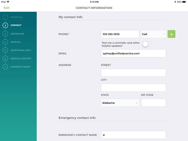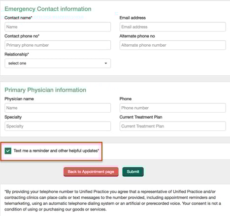 - When the patient fills in their Personal & Demographic information, they will be able to select the checkbox to opt-in to text messages.