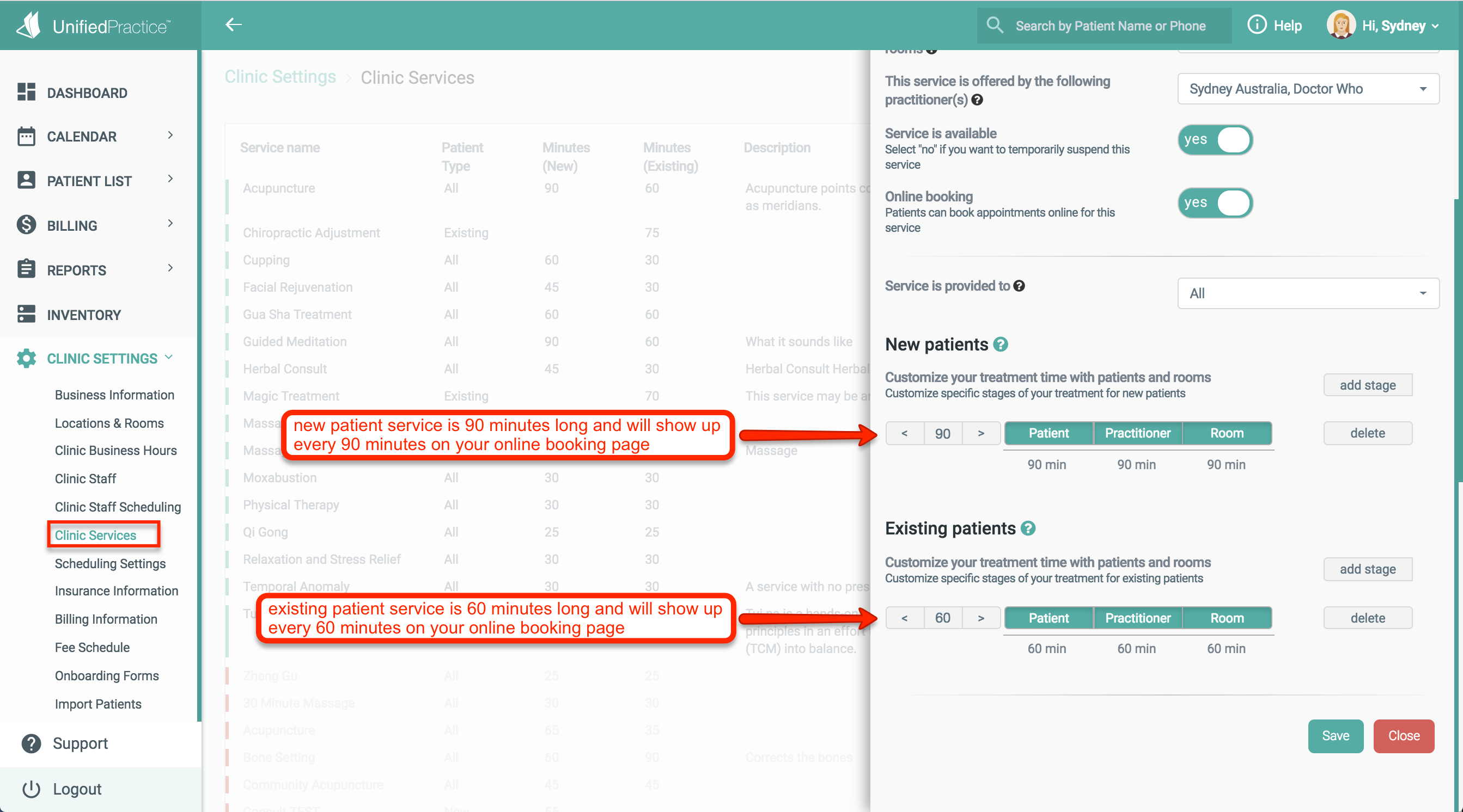 In this example, the service will be 30 minutes for New patients and 15 minutes for existing patients.