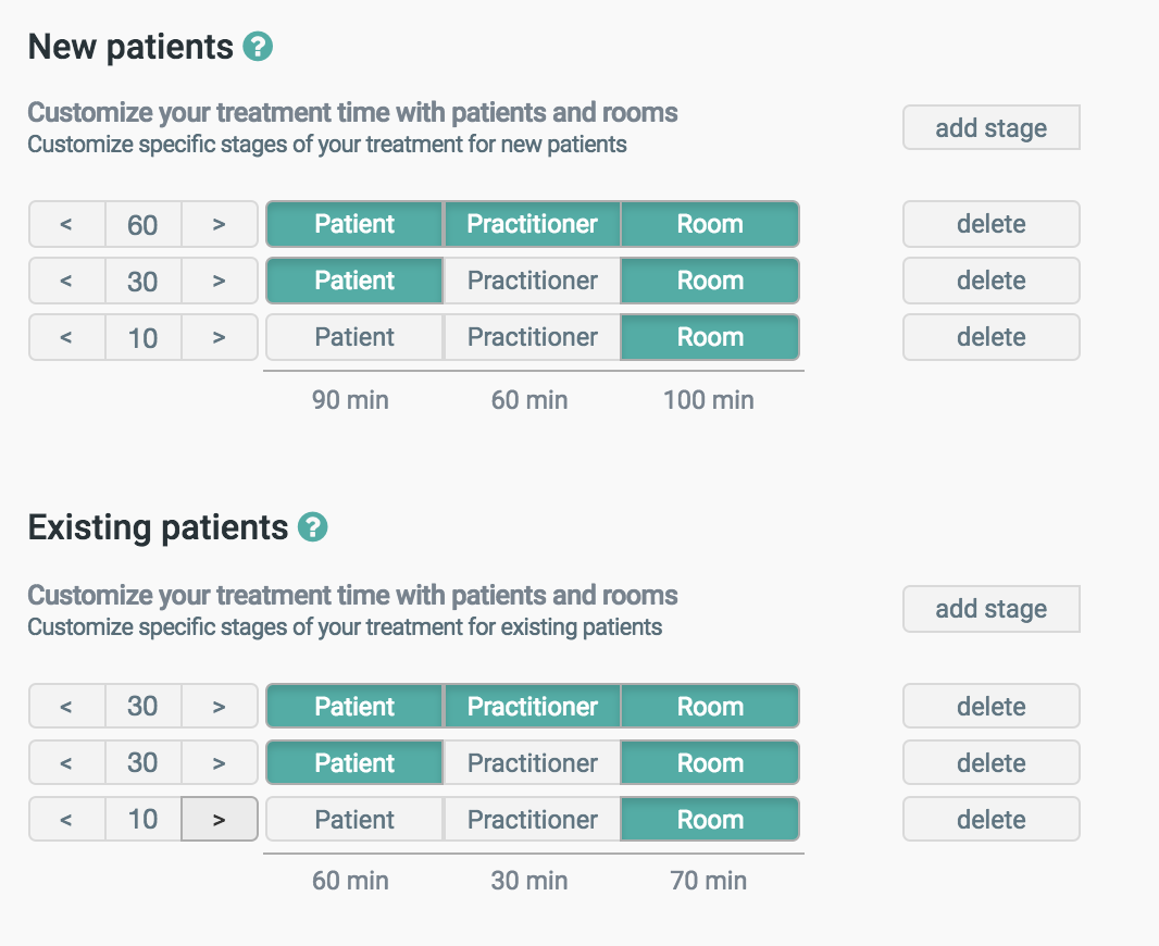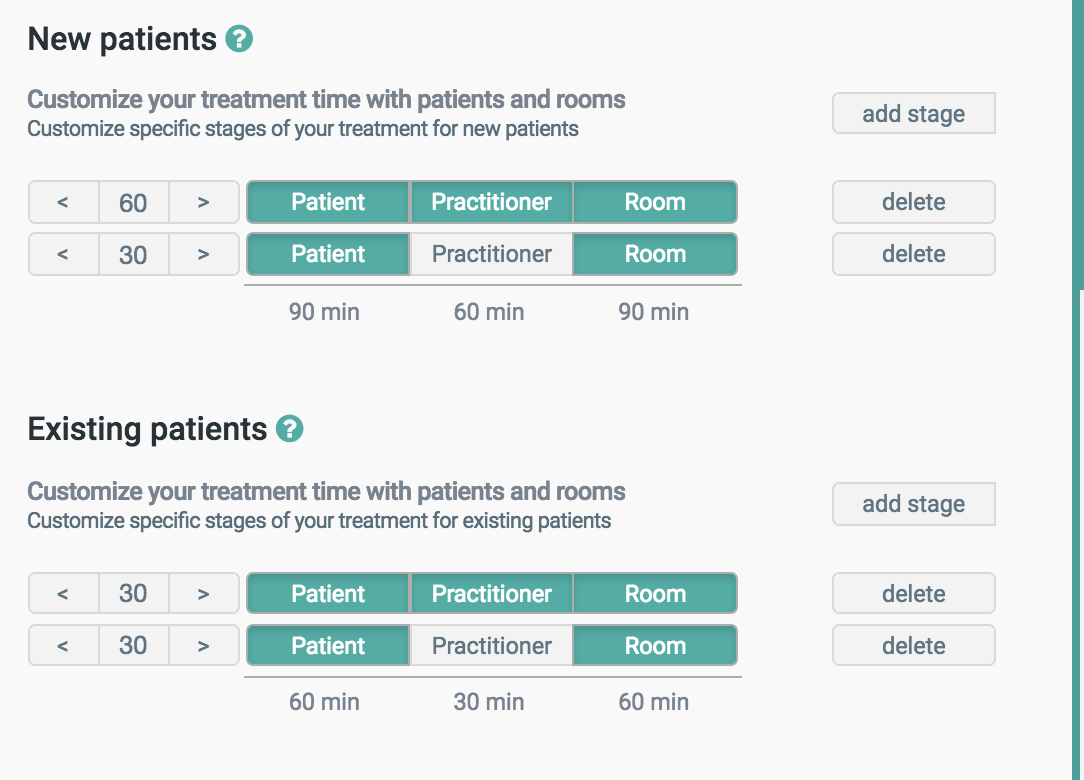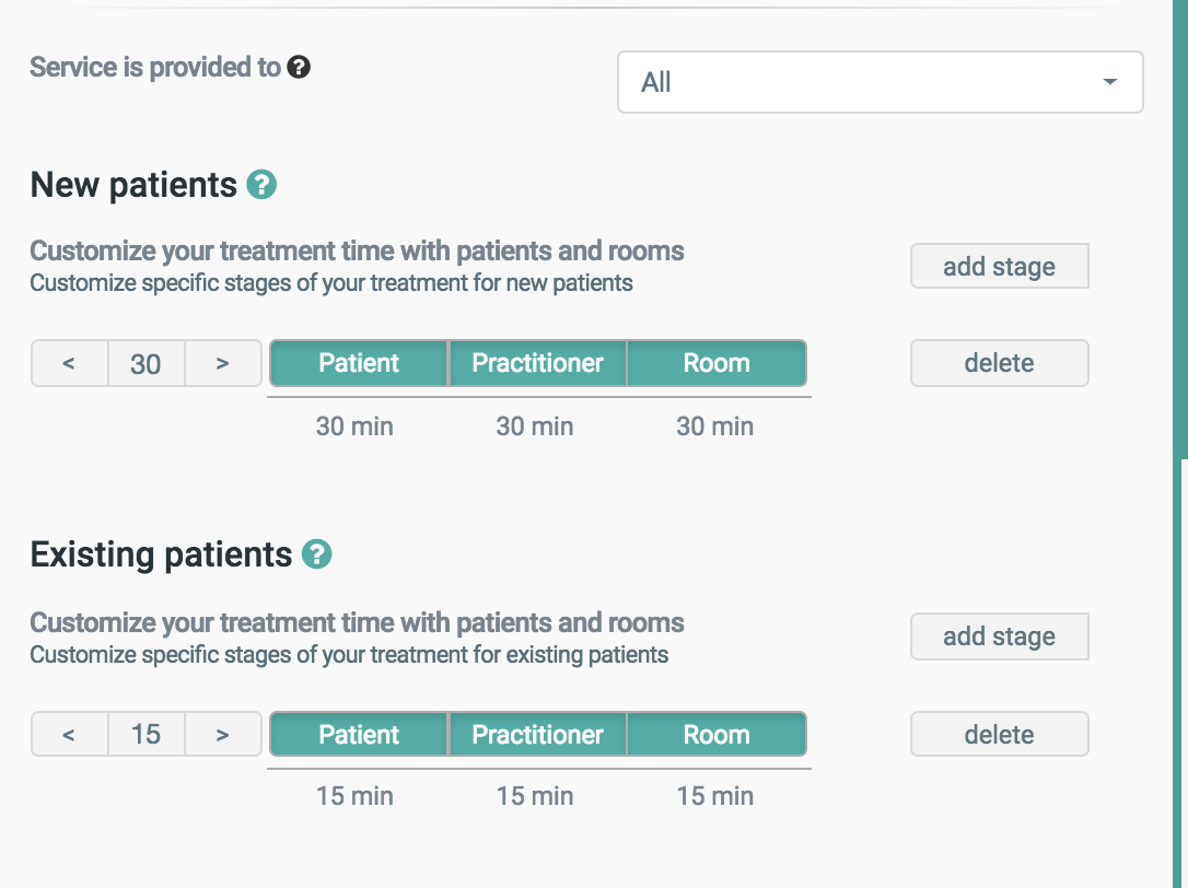 If you would like your online scheduling to show an increased frequency of availabilities, add additional stages after the first stage to increase the length of the service for the room, patient and/or practitioner while keeping the first stage at the frequency with which you'd like the appointment to be offered.
