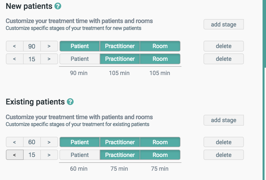 If you have 2 rooms or more, then you can create 2 stages in order to stagger your appointments This allows you to book and start an appointment while another is still in session (instead of only seeing one person at a time). This allows you to see 2 or more patients at a time, working between the rooms. Staging your appointments correctly will prevent double bookings and ensure that you can spend enough time with one patient before leaving the room to start another appointment.