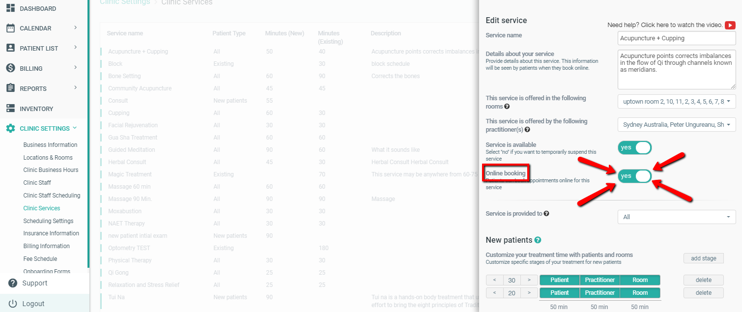 2. In your Clinic Settings go to Clinic Services, and then click Edit next to each service you want to make available for online booking. Switch Online Booking to YES.