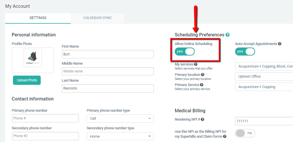 3. Under Account go to My Account and set Allow Online Scheduling to YES.
