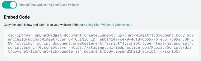 - Enable the toggle for Embed Chat Widget. This will reveal the embedded code.