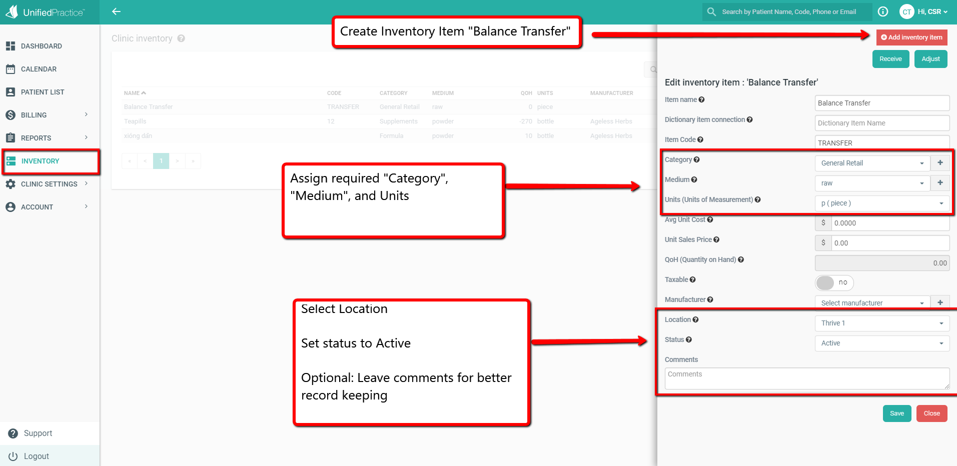 We can easily adjust our patient balances by removing the credit from one account with a "balance transfer" product sale, and then apply it to another account by "receiving a payment."