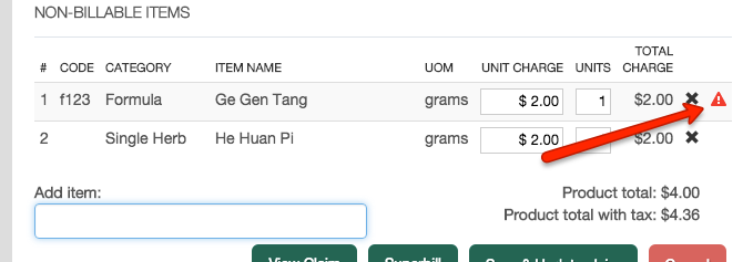 The red alert symbol you're seeing means that the quantity that you're currently billing exceeds the quantity on hand for that item in your inventory. You may want to check to see that you have enough inventory available, or update your QoH on your inventory page to make sure everything is accurate.