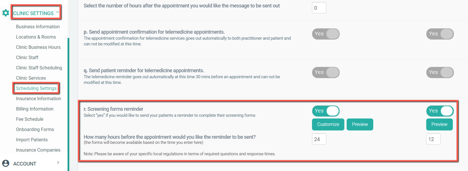 In Clinic Settings > Scheduling Settings > Letter R in your Unified Practice account, turn on the Screening forms reminder(s) and set how many hours before the appointment you would like the reminder(s) to be sent.
