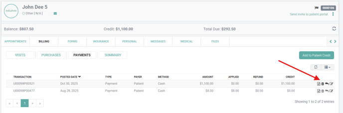 -Remove Purchase: Package will be removed from the patient's file, and any funds paid towards the package will be applied to the patient's credit. From here, you may enter the patient's file and void/refund the payment as needed:
