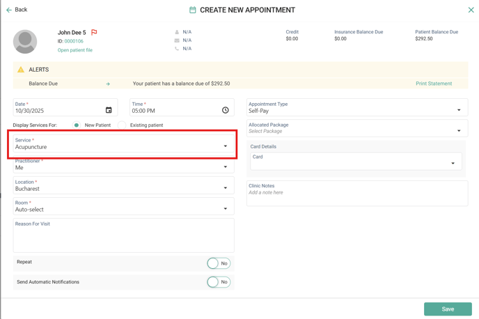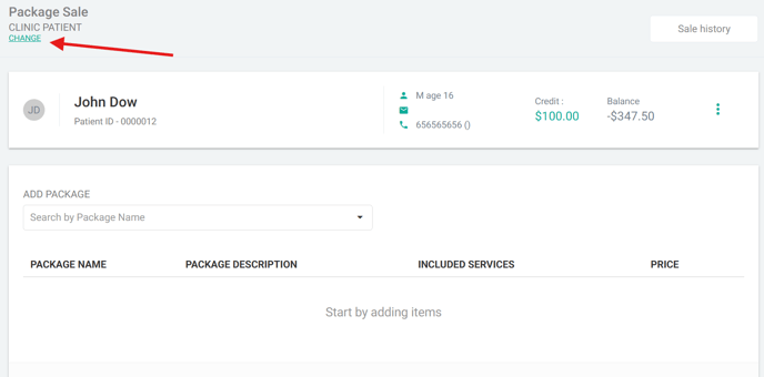 From here, you will be able to get a quick overview of the patient's information, as well as their current balance. You may also change the patient by clicking the "CHANGE" button:
