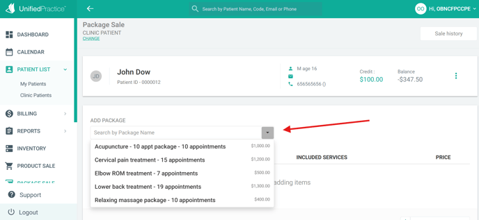 Click on the dropdown bar to reveal your packages. Then, click on the necessary package to add it to the sale. You can add as many packages as you wish: